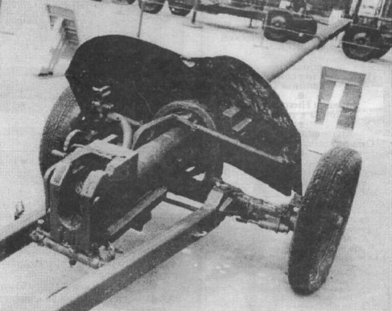 Противотанковая пушка оснащалась подъемным механизмом секторного типа, и винтовым поворотным механизм толкающего типа. Раздвижные станины коробчатого типа. Торсионное подрессоривание. Щит состоял из листа, который установлен под углом 45 градусов, двух откидных верхних щитов и откидного нижнего щита.