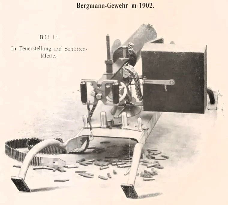 «Бергман в течение последних десяти лет создал несколько образцов автоматического пистолета, а затем конструировал автоматический пулемет, получивший название обр. 1901 г.»