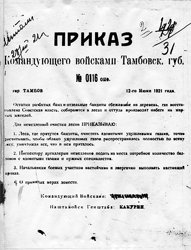 Еще одним примером варварских методов борьбы с повстанцами стал приказ № 116 от 12 июня 1921 г. о применении отравляющих газов. Документально подтверждено использование химического оружия в ходе проведенного 2 августа 1921 г. артобстрела «острова северо-западнее с. Кипец Карай-Салтыковской волости», в результате которого было выпущено 59 химических снарядов.