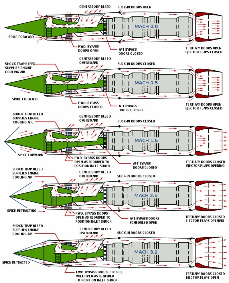 На до- и сверхзвуковых скоростях конусы воздухозаборников находились в переднем положении и оптимизировали поток на входе в двигатель. При росте высоты и скорости осуществлялось их смещение назад. На скоростях более М=3 поток воздуха разделялся между ПВРД и ТРД, которые создавали 80 и 20 проц. тяги соответственно.