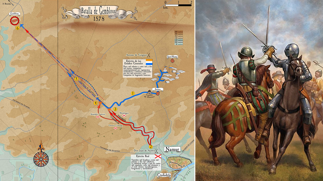 31 января 1578 года 1200 испанских кавалеристов наголову разгромили 20-тысячную вражескую армию, истребив не менее трех тысяч солдат противника и захватив в плен более семи тысяч. При этом их собственные безвозвратные потери составляли всего 12 погибших и умерших от ран. Вы, наверное, подумали, что это был очередной погром, устроенный конкистадорами американским индейцам, впадавшим в ступор от вида всадников и грома мушкетных залпов. Но, нет. Сражение произошло на территории современной Бельгии, возле укрепленного города Жамблу, а оппонентами испанцев была регулярная армия Нидерландов, вооруженная и экипированная ничуть не хуже, чем их противники.