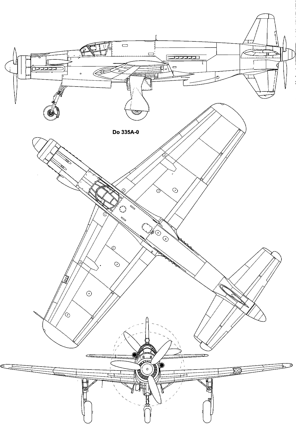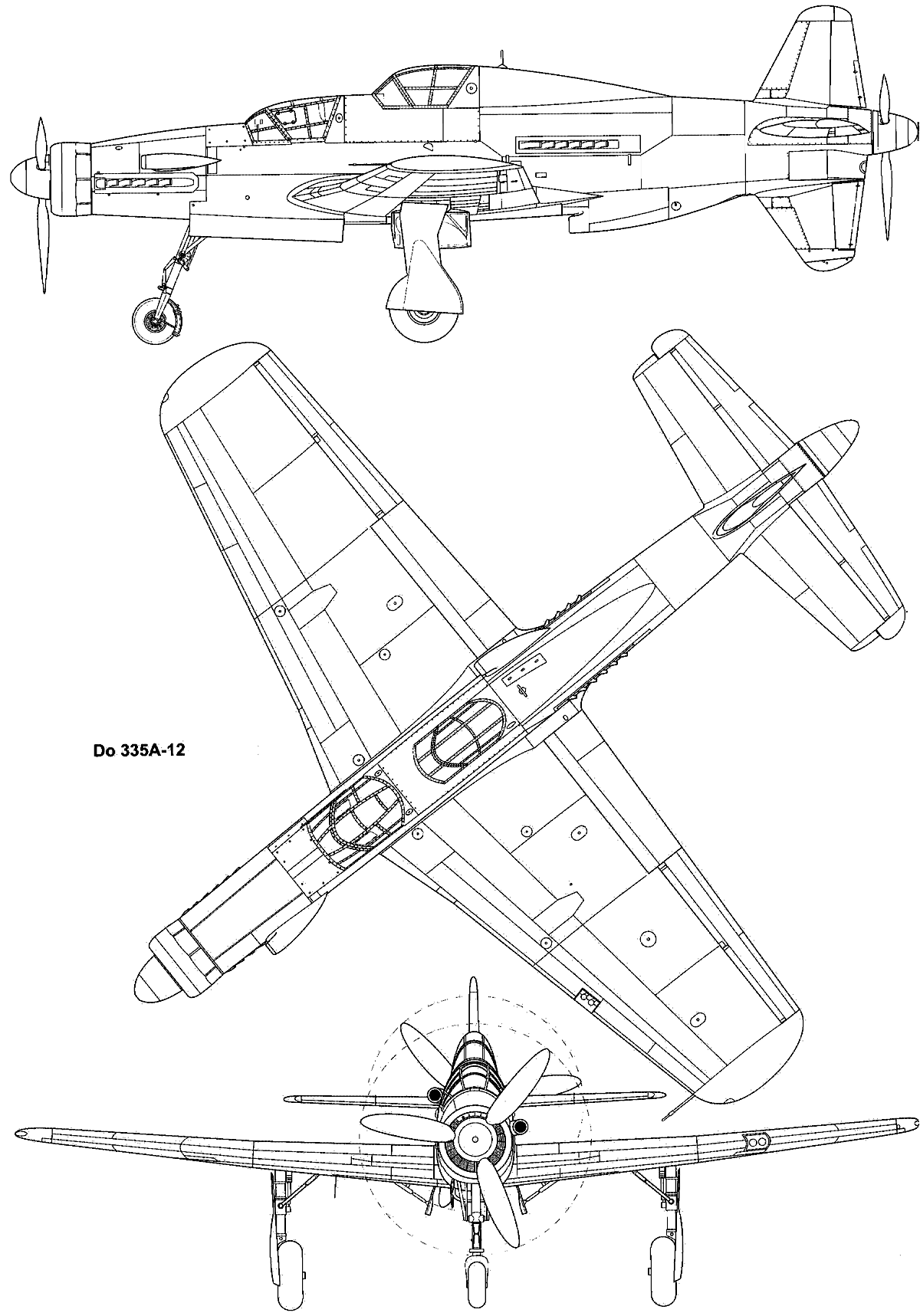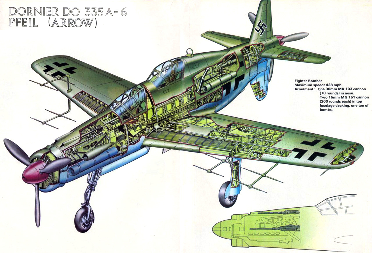 80 лет назад, 26 октября 1943 года, впервые взлетел прототип тяжелого двухмоторного многоцелевого истребителя Дорнье Do.335 «Пфайль» («Стрела»). Он имел необычную, хотя и встречавшуюся ранее конструктивную схему с тандемной силовой установкой, состоявшей из двух 1800-сильных двигателей водяного охлаждения Даймлер-Бенц DB 603E, установленных в носу и в хвосте фюзеляжа. Это давало значительный выигрыш в аэродинамике по сравнению с «традиционным» размещением двигателей на крыле, благодаря чему «Пфайль» развивал близкую к предельной для поршневой машины скорость — 785 км/ч.