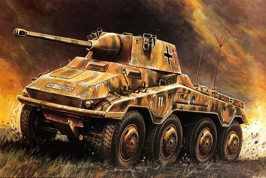 Когда в августе 1940 года подписывалось задание на проектирование тяжелой бронемашины на четырехосном полноприводном шасси, предполагалось, что ее вооружение будет состоять из 20-мм автоматической пушки KwK38 L/55, способной вести стрельбу по воздушным целям, и спаренного с ней 7,92-мм пулемет MG 42. Но в докладе об испытаниях прототипа, датированном 1 июля 1942 года, был впервые поднят вопрос об усилении вооружения новой бронемашины. В узкопрофильной башне, предназначавшейся для разрабатывавшихся разведывательных танков «Лухс» и « Леопард», предлагалось установить 50-мм пушку KwK39/1 и спаренный с ней 7,92-мм пулемет MG 34. При этом речь вовсе не шла об отказе от 20-мм автоматической пушки KwK38. Это предложение нашло широкую поддержку среди руководства вермахта, поскольку с таким вооружением подвижный и маневренный бронеавтомобиль становился неплохим средством борьбы с легкими танками и боевыми разведывательными машинами противника.