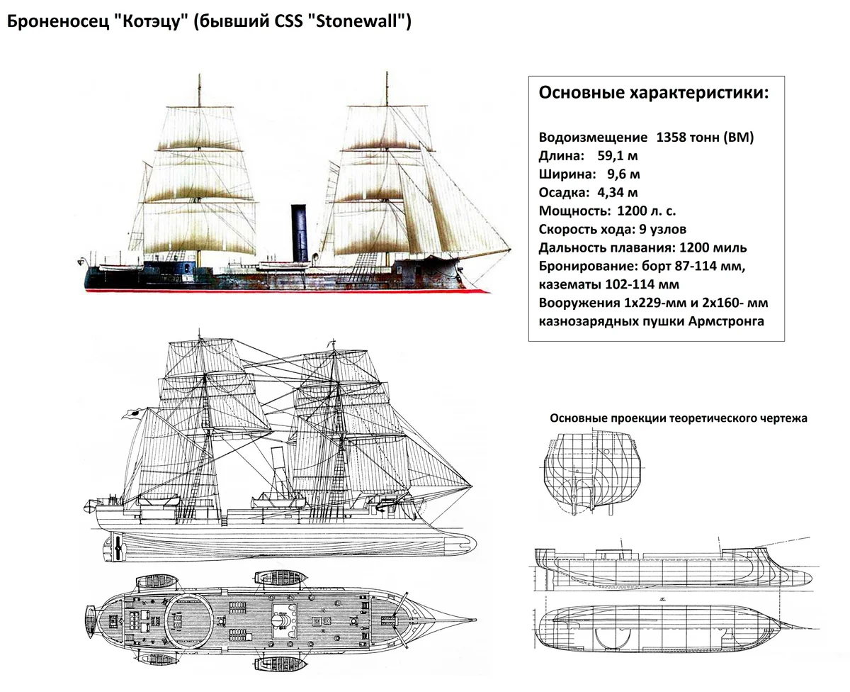 Но на родине он уже не был востребован. Война была окончена, флот и расходы на него начали сокращать. Стали думать, что делать с броненосцем. Решение пришло в следующем году, когда его захотел приобрести сёгунат Токугава, желавший усилить свой флот. Американцы были несказанно рады, поскольку самураи были готовы выложить за корабль аж 400 000 долларов! Пока бывший «Стоунволл» пробирался вокруг Южной Америки к новым хозяевам, политическая ситуация успела поменяться. Когда в апреле 1868 года он прибыл к японским берегам американцы уже не торопились передавать его сторонникам сёгуна. Выдумав предлог, они вновь подняли над ним звездно-полосатый флаг, ожидая кто-же победит в японской междоусобице. Все это время на корабле размещалось американское торговое представительство. В январе 1869 года корабль в восьмой раз сменил владельца — теперь им стало императорское правительство Японии.