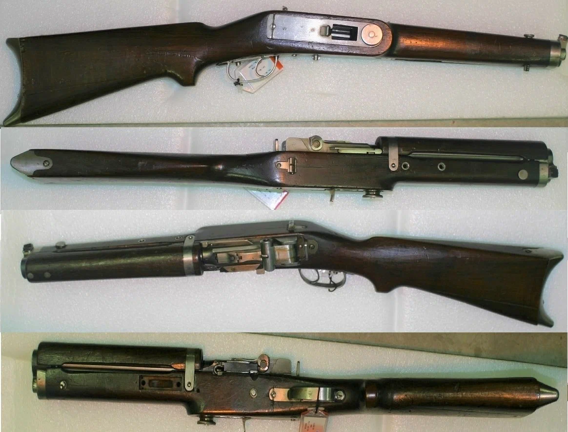 Ко всему этому прилагались деревянная ложа винтовочного типа, деревянные ствольные накладки, скрывающие ствол и газовый ускоритель и сошка с деревянной рукоятью.