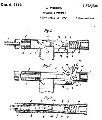 Во-первых, Адольф Фуррер поставил свою систему рычагов, которая, хотя работала также, как и у Георга Люгера, но имела дополнительный рычаг, связывающий два других рычага с ствольной коробкой и располагавшийся перпендикулярно по отношению к ним (система была запатентована и ставилась Фуррером и на других, более поздних, разработках).