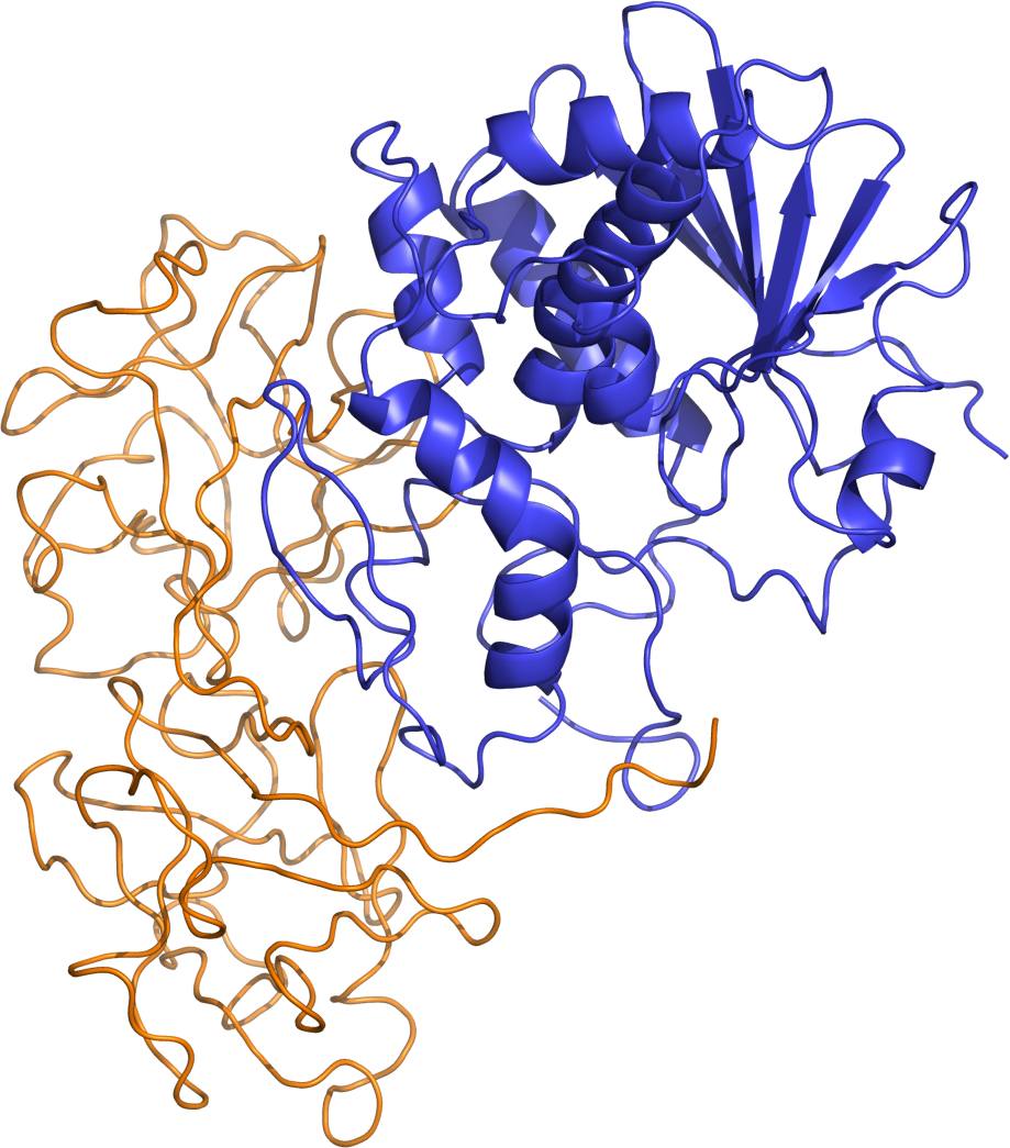 Пространственная структура рицина. Цепь А изображена синим цветом, цепь B — золотистым