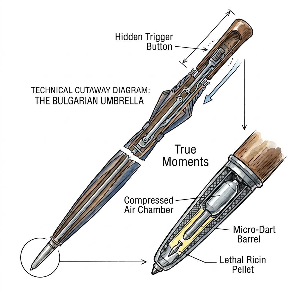 История шпионажа знает немало примеров изощренного оружия, но инцидент на мосту Ватерлоо в 1978 году остается непревзойденным образцом инженерного коварства. Это убийство, жертвой которого стал болгарский диссидент Георгий Марков, превратило обычный предмет гардероба — мужской зонт-трость — в символ смертоносных технологий Холодной войны. Техническая реализация этого устройства, получившего в массовой культуре название «болгарский зонтик», представляла собой сложный симбиоз механики, материаловедения и токсикологии, разработанный в секретных лабораториях КГБ. С точки зрения механики, это было не огнестрельное оружие, а бесшумная пневматическая винтовка скрытого ношения. Внутри полого стержня зонта размещался маломощный баллон со сжатым газом или пружинно-поршневой механизм, который приводился в действие нажатием замаскированной кнопки в рукоятке. При активации в наконечник зонта подавалась струя сжатого воздуха(или другого газа), которая выталкивала микроскопический снаряд с энергией, достаточной для того, чтобы тот пробил одежду и вошел в мягкие ткани человека, не вызывая при этом сильной боли. Жертва ощущала лишь легкий укол, который можно было принять за случайное прикосновение прохожего или укус насекомого.