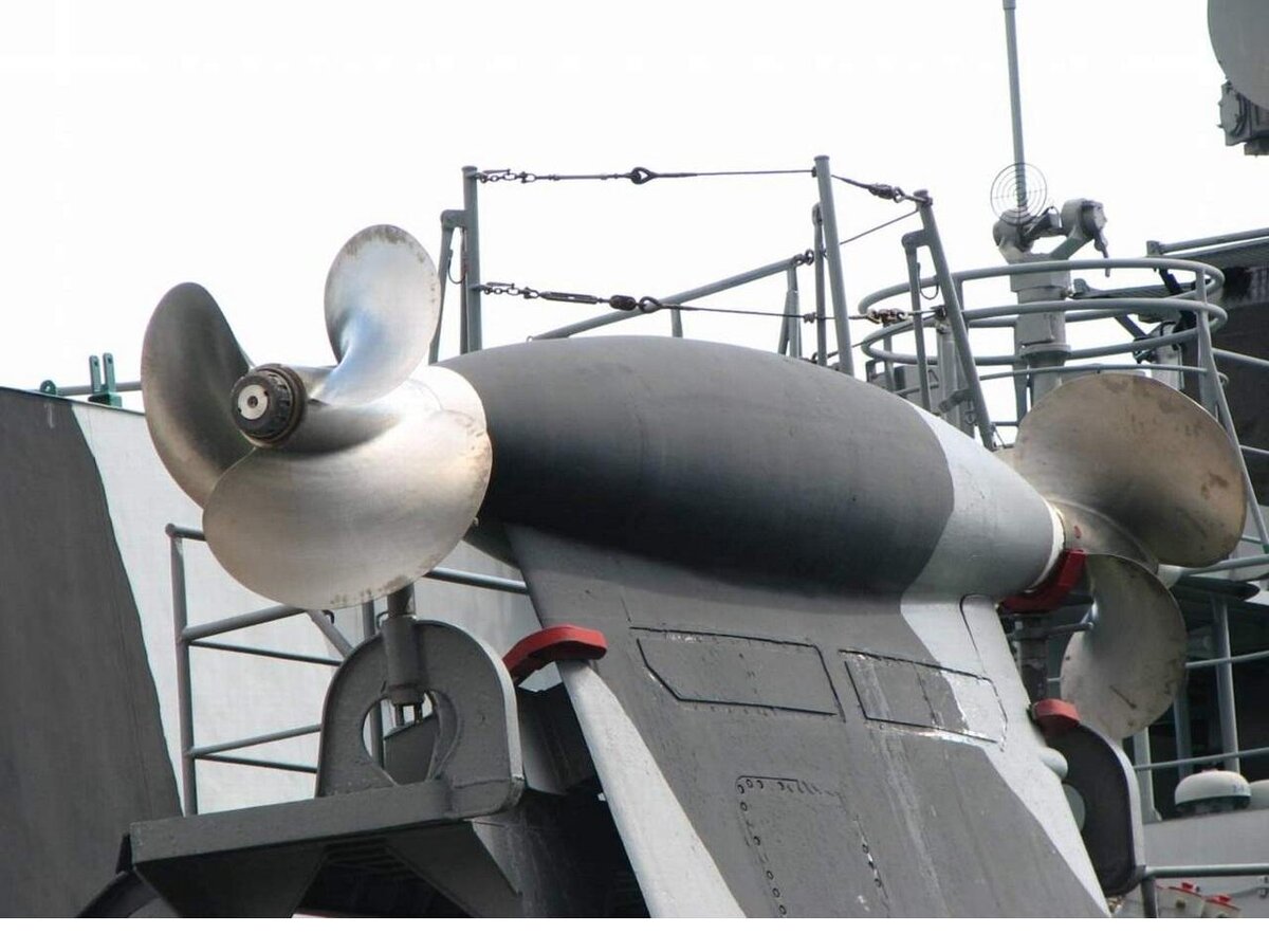 Параллельно шла и разработка главной энергетической установки. После оценки нескольких вариантов выбор остановили на дизель-газотурбинной установке схемы CODAG (с совместной работой дизелей и газовых турбин на полном ходу). Для высокоскоростного режима предусмотрели поворотные опускные колонки с винтами, приводимыми в действие газовыми турбинами. Конструкция их аналогична соответствующим узлам МРК-5 (проект 1240), также разработанного в конструкторском бюро «Алмаз».