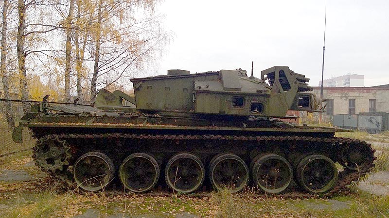 Вот такая вот странная конструкция была создана в 80-х годах конструкторами из Нижнего Тагила. Машина разминирования, с шифром НИР «Гобой», она же «объект 190» имела совершенно дикий и в чем-то даже безумный метод разминирования. Нет, ну, в задней части башни, как я понимаю, располагался запас боеприпасов, — весь вопрос в том, каких именно. Посмотрите, вот в передней части надстройки было смонтировано два (слева и справа) агрегата «ближнего разминирования». Как это все работало? Просто, объемной детонацией…