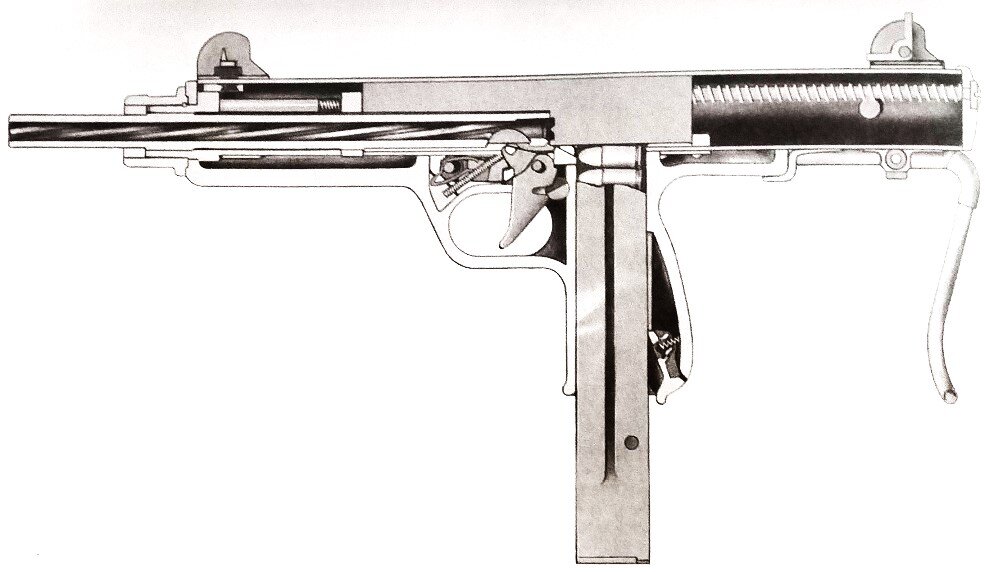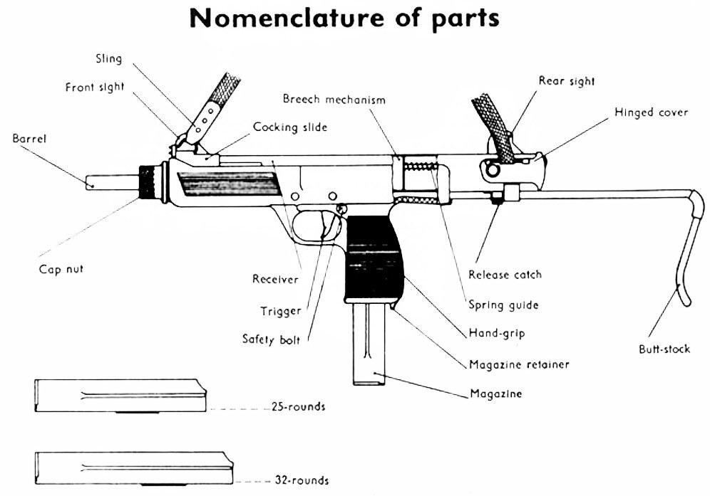 В лучших традициях «пистолетно-пулеметной философии» тех лет оружие получило прямоугольную штампованную ствольную коробку, ствол, который крепился к ней гайкой, прямоугольный же затвор с расположенной за ним возвратной пружиной и складной (выдвижной) приклад.
