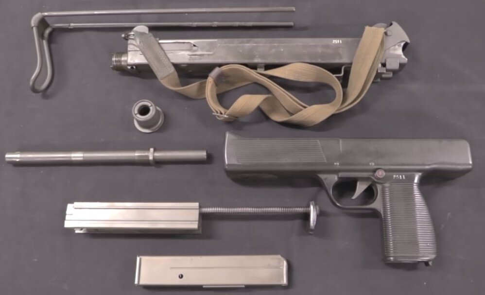 Отдельно следует упомянуть порядок разборки — следовало нажать на кнопку на затыльнике ствольной коробки и поднять затыльник вверх на 90 град. После этого можно было извлечь затвор с возвратной пружиной. Для снятия ствола надо было открутить гайку. После этого полимерная нижняя часть вместе с пистолетной рукояткой и УСМ отделялась от прямоугольной ствольной коробки.