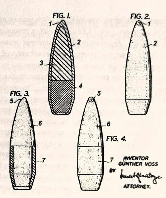 «Пуля имеет оболочку, в которой асимметрия создается наклоном вершинки (1). Несмотря на этот скос, оболочка 2 закрыта спереди и не имеет отверстия, которое может вызвать деформацию пули при поражении цели, что запрещено международными соглашениями. Чтобы получить центр тяжести пули как можно дальше от вершинки, передняя часть сердечника 3 делается из материала малой плотности, например, из пластмассы, а задняя часть — из материала высокой плотности, как, например, свинец. На фиг. 3 и 4 скос 5 делается на сердечнике 6 из прочного материала малой плотности, например, из дюралюминия, который не подвергается деформации при ударе о цель малой прочности. Оболочка 7 выполнена из тяжелого материала, например, томпака, и охватывает только заднюю часть пули, чтобы центр тяжести был как можно дальше от вершинки, так что длина передней части сердечника, которая выступает из оболочки 7, составляет по крайней мере 45% общей длины пули».