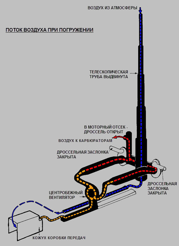 Дроссельные заслонки в трубах между соединительной магистралью и вентиляторами охлаждения, также как и заслонки, межу моторным отсеком и вентиляторами охлаждения, перекрывались на время погружения. Управление заслонками осуществлялось рычагом, расположенным на перегородке отделяющей моторный отсек от боевого отделения.