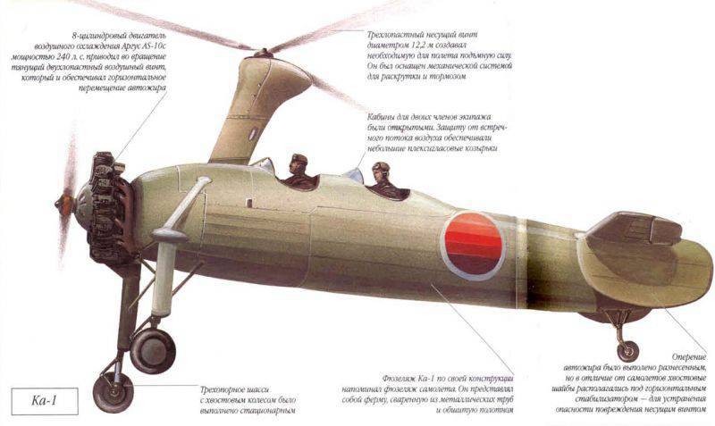 Перед началом Второй мировой войны японский императорский флот имел в своем распоряжении автожиры Kayaba Ka-1, которые были предназначены для ведения разведки и противолодочной борьбы, они могли нести две 60-кг глубинных бомбы. Еще в 1939 году японцам через подставные фирмы удалось купить один экземпляр автожира Келлет KD-1A у США. Созданная еще в 1934 году машина по своей внешней компоновке была аналогична английскому аппарату Cierva С.30. Данный аппарат отличался наличием двух открытых кабин с тандемным расположением членов экипажа. На автожире был установлен 7-цилиндровый звездообразный двигатель воздушного охлаждения Якобс L-4M4, развивавший мощность 225 л.с. Двигатель приводил в действие несущий трехлопастный винт со складывающимися лопастями, который оснащался механической системой для раскрутки и тормозом.