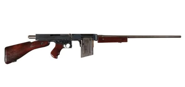 По данным аукциона, этот прототип создавался Auto-Ordnance в 1943 году и по сути представляет собой «самозарядную винтовку», предположительно, с возможностью автоматического огня. Указанные размеры и масса впечатляют: ствол длиной примерно 580 мм и масса около 7,7 кг без патронов (≈17 фунтов) делают изделие заметно крупнее и тяжёлeе стандартной модели Томпсона. Для подачи длинного патрона применялись модифицированные магазины под более длинные винтовочные патроны, что так же потребовало удлинить затворную коробку.