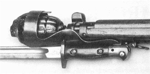 Одним из самых элегантных винтовочных гранатометов Первой Мировой был, наверное, британский No.1 Mk.1 Grenade discharger (1916). Собственно, он состоял из одной изогнутой штамповкой металлической пластины. Она крепилась на стволе так, чтобы стандартная граната Миллса с ввинченным в донце стержнем, который вставлялся в ствол, устанавливалась так, чтобы рычаг предохранителя зажимался изгибом гранатомета, в патронник заряжался холостой патрон и, в общем-то все.