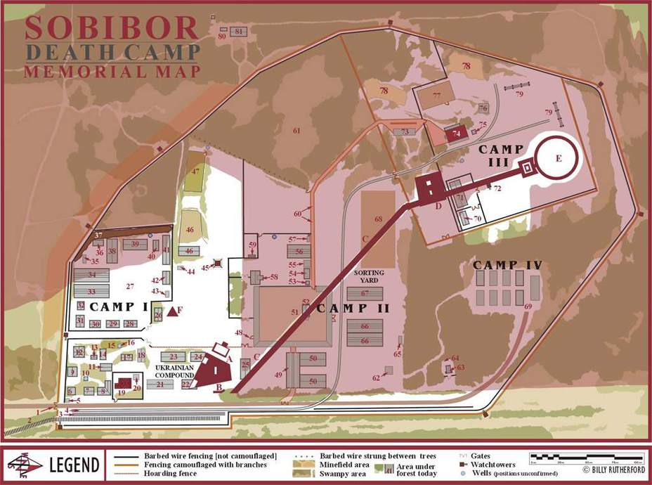 Внутренний периметр лагеря делился на три зоны, и каждая имела своё конкретное предназначение. Первая зона была отдана под мастерские и жилые бараки, во второй разместились парикмахерские бараки и склады, на которых сортировались и хранились вещи уничтоженных заключённых, но самой страшной была третья зона. Там находились так называемые «бани», которые представляли собой кирпичные здания с пристройками, в которых были установлены танковые моторы. После их запуска выхлопные газы по трубам подавались в «бани», где могло находиться до 800 узников. За весь период действия лагеря (15.05.1942 – 15.10.1943) в этих газовых камерах было умерщвлено примерно 250 000 человек. Большая часть из них отправлялась в «бани» сразу по прибытию в лагерь. После этого те, кого оставили в живых, свозили трупы к месту массового захоронения, а затем распределялись на хозяйственные работы. Фактически, «конвейер смерти» обслуживали те, кто в дальнейшем сам становился его жертвой.
