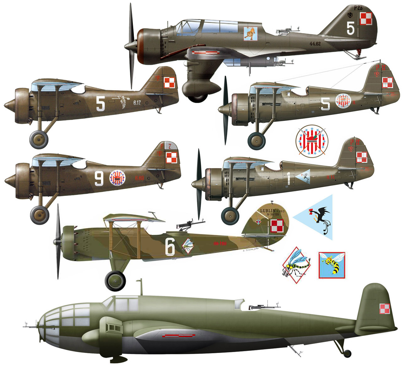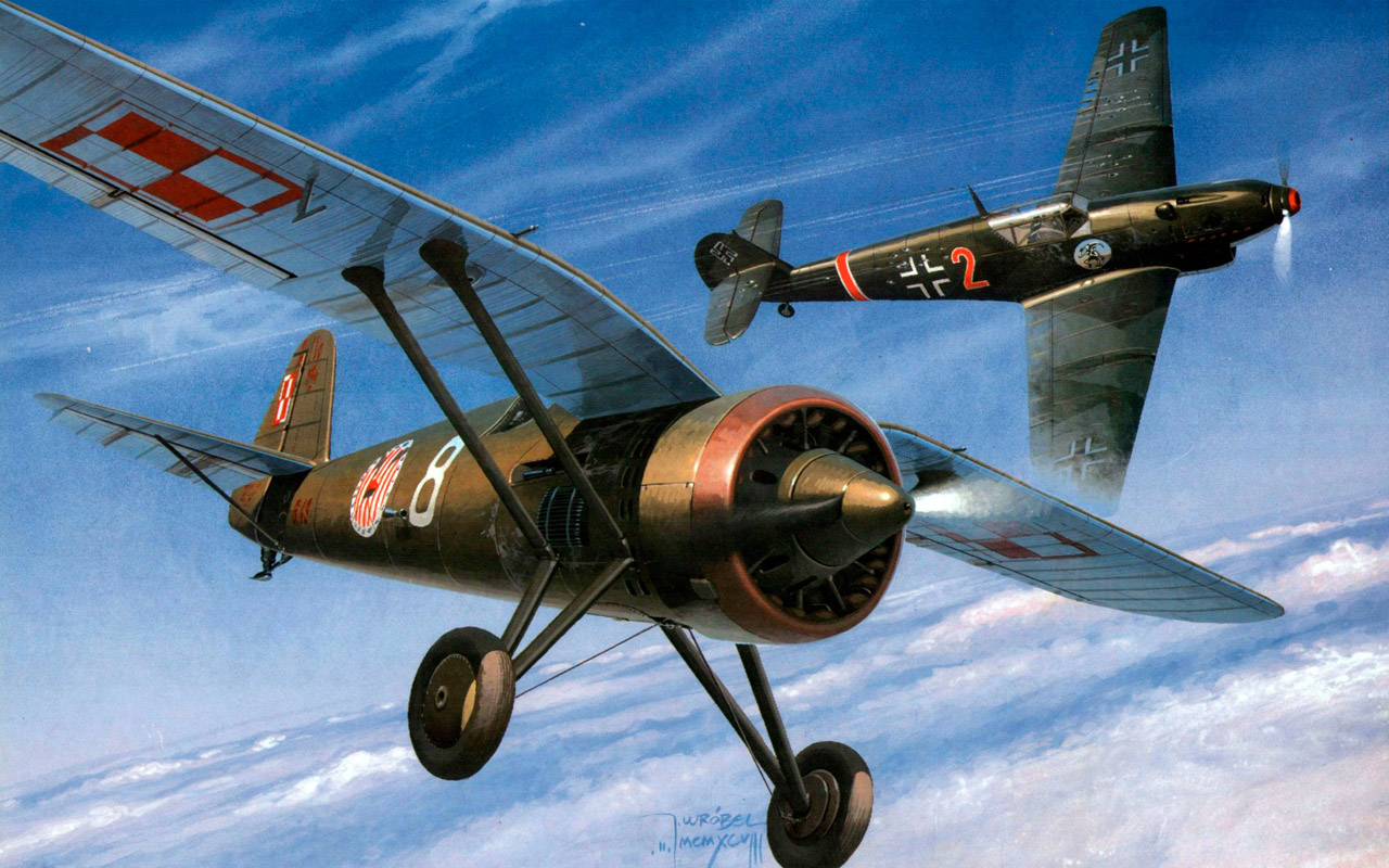 Польские самолеты, принимавшие участие в отражении немецкой агрессии в сентябре 1939 года, сверху — вниз и слева — направо: