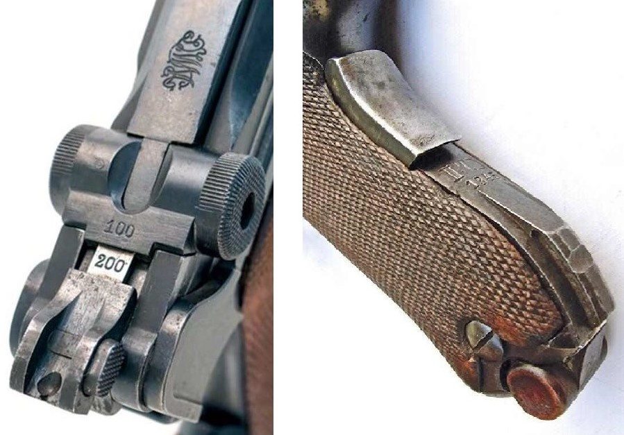 Одним из главнейших достоинств конструкции Борхардт-Люгера является наличие в этой системе двух предохранителей, одного обыкновенного и другого автоматического (выжимной на рукояти).