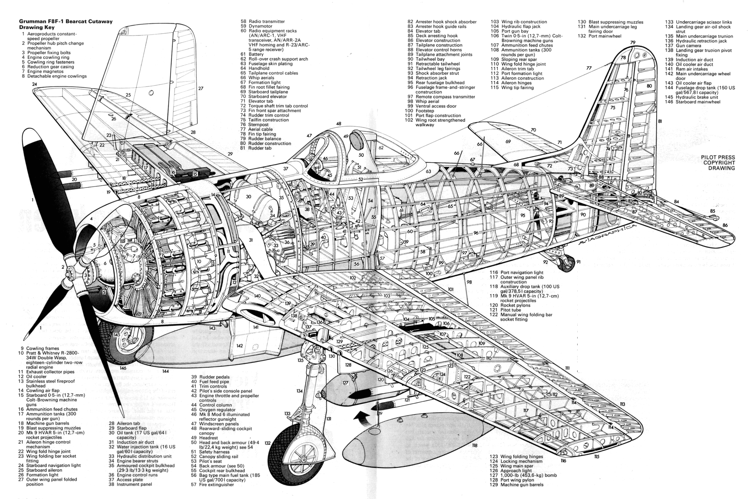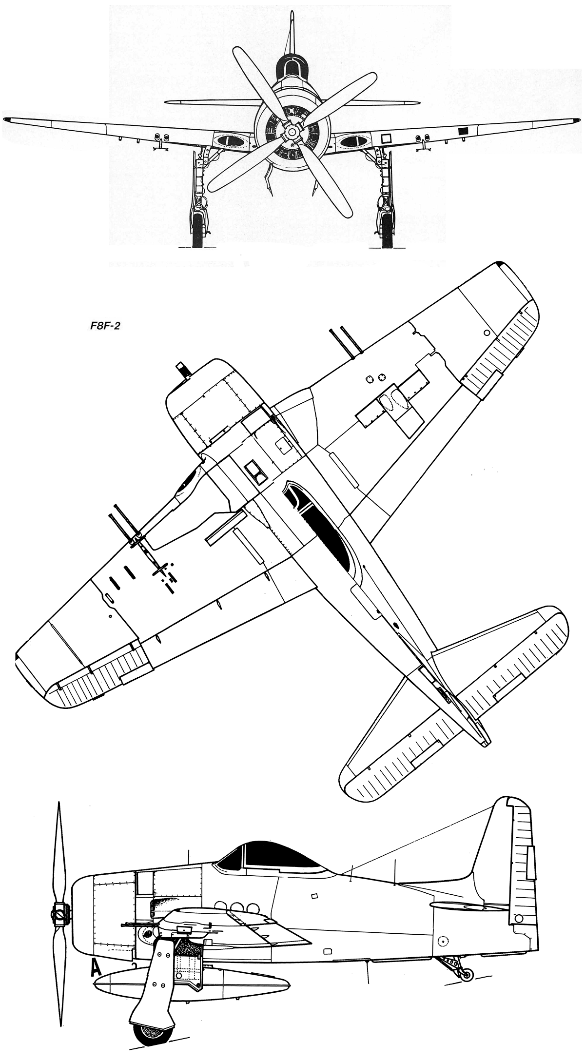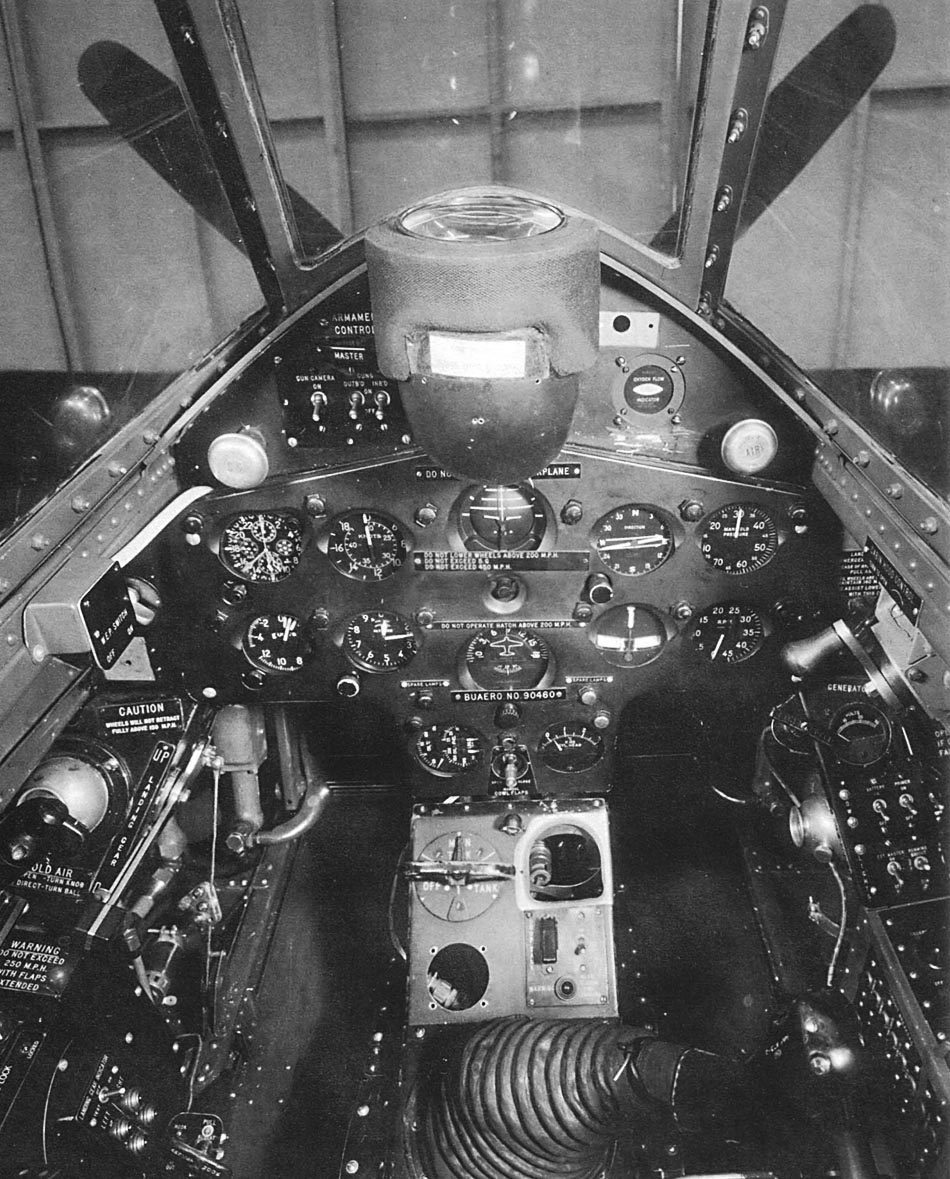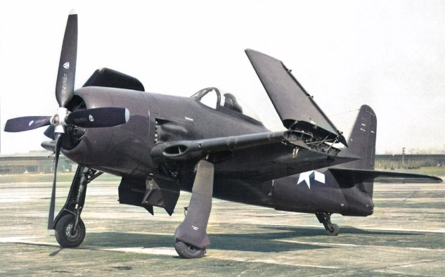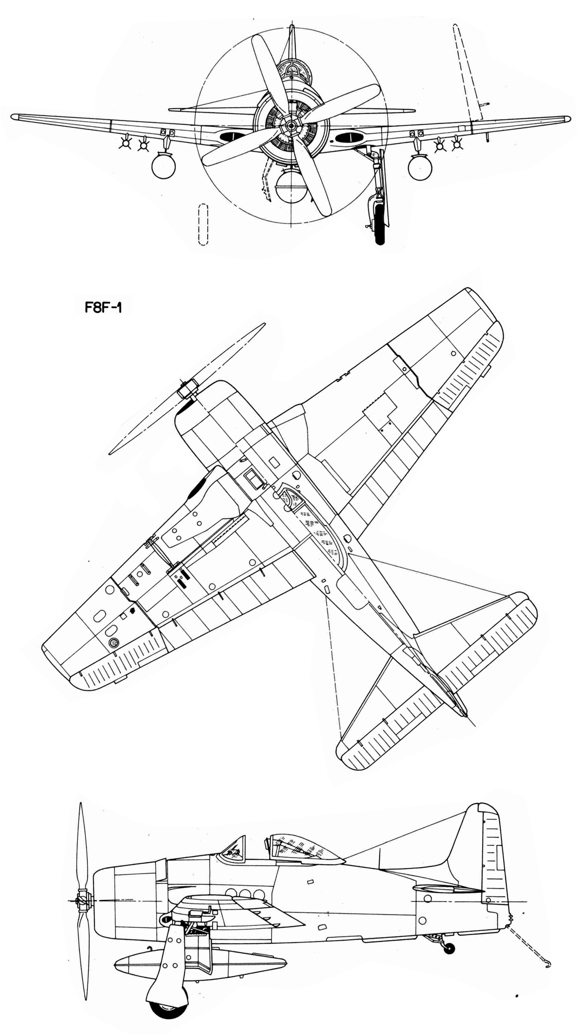 | Вооружение: | F8F-1: четыре 12,7-мм пулемета Cplt-Browning с 300 патронами на пулемет. F8F-1В четыре 20-мм пушки Ford с 205 снарядами на пушку. Подвесное вооружение: 4 сверхзвуковых НАР HVAR калибром 127 мм и 2 бомбы по 450 кг под крыльевыми пилонами или 1 бомба 725 кг вместо ПТБ. Бевой ПТБ емкостью 568 л, под бомбовые пилоны возможна подвеска двух ПТБ по 757 л. |