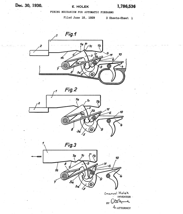 Разместив сам газовый двигатель под стволом, что для тех лет было нормальной идеей (дабы иметь возможность при длинном ходе газового поршня снаряжать магазин и обоймами сверху), Холек неизбежно был вынужден связывать его с затвором боковой тягой. А, поскольку им было выбрано запирание перекосом затвора (да, не будем уточнять, кто из семьи Холеков его до этого уже воплотил в металле), то Эммануил поступает просто — раз тяга сбоку, то и затвор будет перекашиваться не в вертикальной плоскости, а вбок. Однако из-за бокового перекоса он оказывается вынужден перекосить вбок и ствол, чтобы сохранить параллельность зеркала запертого затвора с казенным срезом ствола: